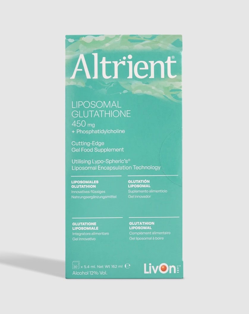Altrient Glutathione est composé de cinq ingrédients seulement et ne contient pas de sucres, d'édulcorants, de colorants, d'arômes, de gluten, de produits laitiers, de fruits à coque, d'ingrédients OGM ou de sous-produits animaux. Les sachets à usage unique garantissent une stabilité optimale des liposomes et un dosage précis à chaque fois.